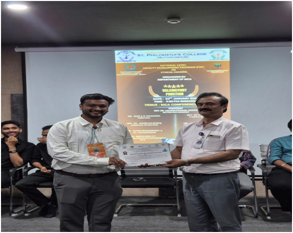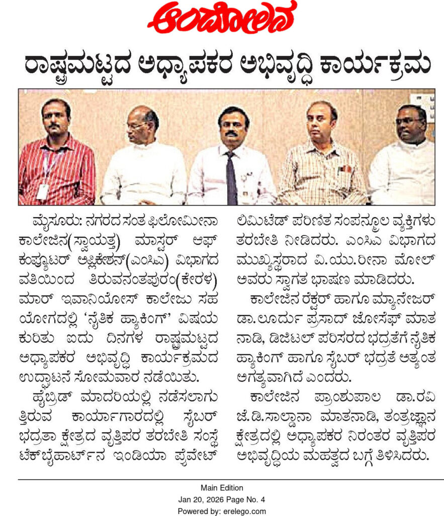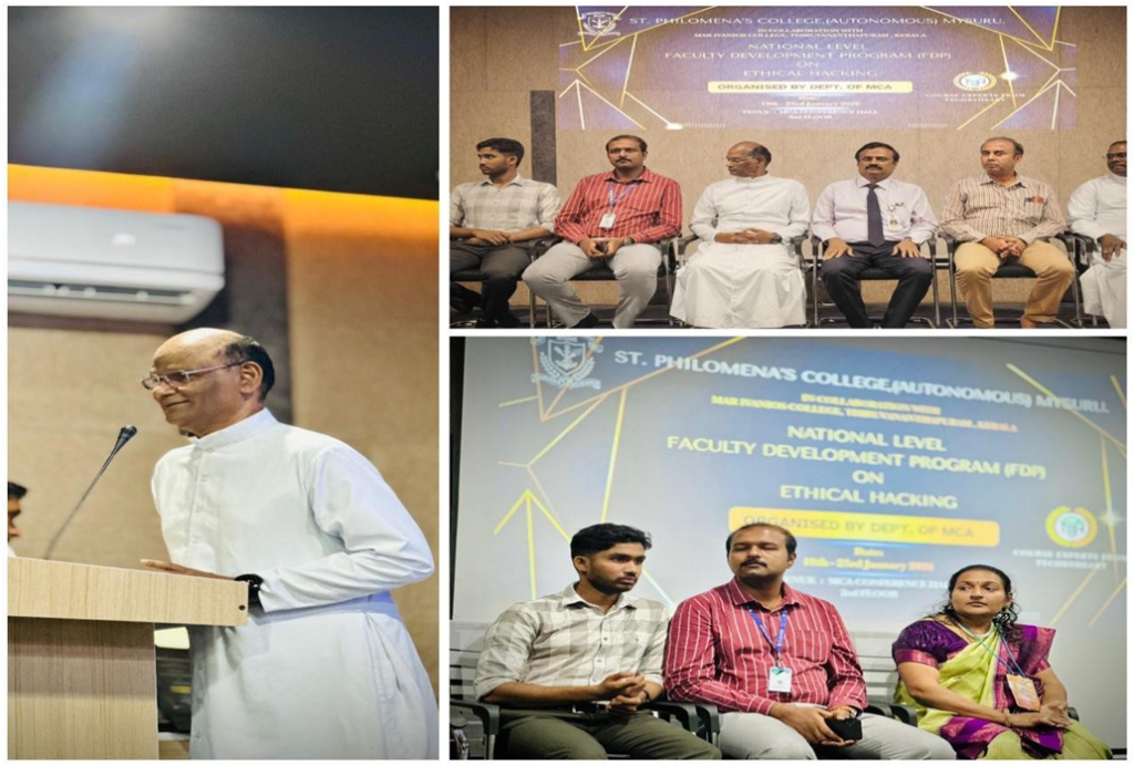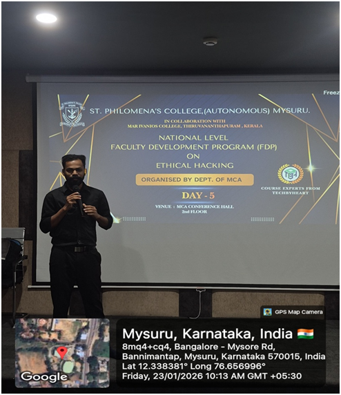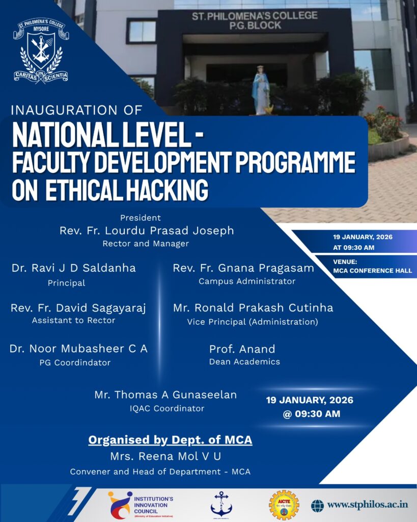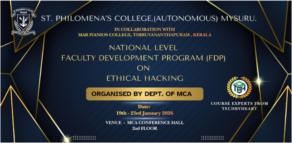 A “NATIONAL LEVELFACULTY DEVELOPMENT PROGRAMME (FDP) ON ETHICAL HACKING”was successfully conducted from January 19, 2026 to January 23, 2026 in the MCA Conference Hall, 2ndFloor, PG Block, St. Philomena’s College. The session was organized by the Department of MCA, St. Philomena’s College (Autonomous), Mysore, and was led in Collaboration with Mar Ivanios College, Thiruvananthapuram, Kerala & Course Experts from Techbyheart.