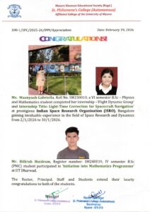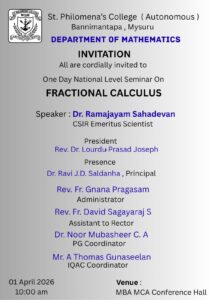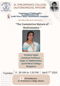 In order to open the doors to the students from every walk of life irrespective of caste, class, religion and ethnic background,in experiencing the learning process in Mathematics, St. Philomena’s College, the first science college of the Mysore state, during its establishment, incepted Mathematics department in the year 1946. To cater to the ever growing needs of the stakeholders of the poor socio-Economic and academic background, BSc was introduced under the Science stream with a bunch of students, under the headship of Mr. E. N. K. Viswanathan. In the year 1948, to shape up the steady growth of the departmentMr. L. N.Chakravarthi too joined the department of Mathematics. The department witnesses a constant crescendo owing to the indefatigable efforts to the following faculty members to whom we owe our present status. With reverence, we place on record our salutations, sincere gratitude and words of appreciation to the stalwarts of the department of Mathematics.