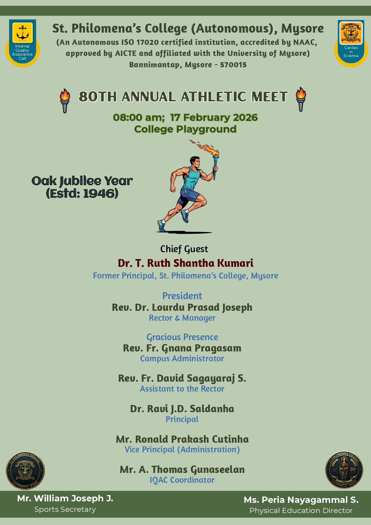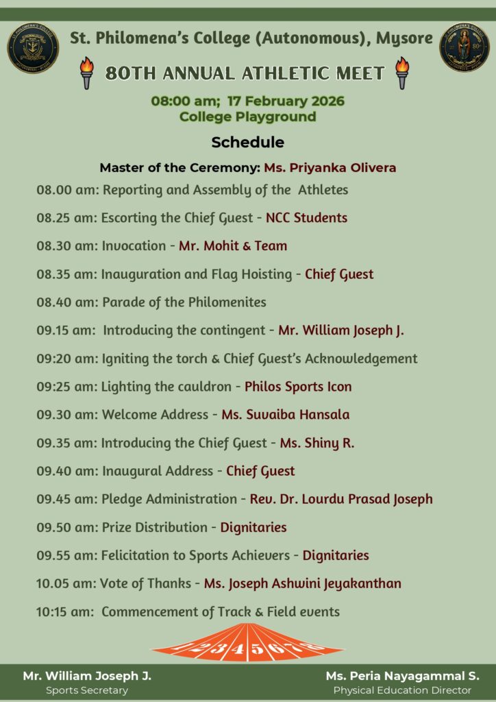 ANNUAL ATHLETIC MEET- 2026 Posted by Mirium Categories Events, Events, Events, Flash News, Flash News, Physical Education Date February 13, 2026 Share: Mirium Previous post Congratulations February 13, 2026 You may also like FIELD VISIT February 11, 2026 Flea Market February 11, 2026 UG & PG Revaluation Notice February 10, 2026