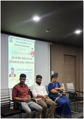 The workshop was coordinated by the Head ofthe Department, Dr. Ginson George, along with the support of UG and PG facultymembers. The programme began at 9:30 AM, with Saniya serving as the host ofthe workshop and Nandana delivering the welcome speech, followed by Shabilintroducing the resource person and chief guest, Mr. Vigraanth Bapu K. G., Headof the School of Psychological and Social Sciences, Reva University, along withthe presence of PG coordinator Noor Mubasheer ma’am. The workshop witnessedenthusiastic participation from almost all M.Sc. Psychology students, 34 in number.