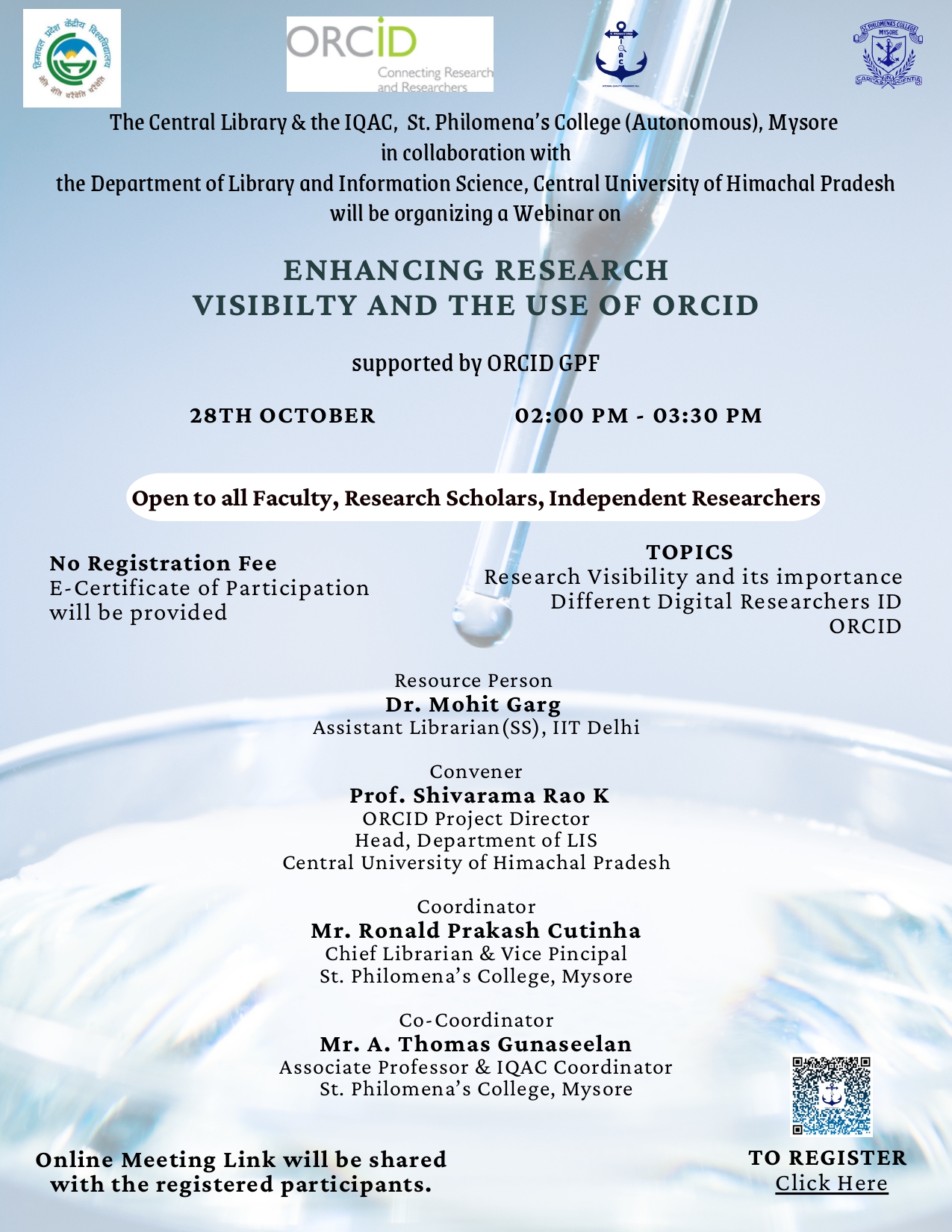 In collaboration with theDepartment of Library and Information Science,Central University of Himachal Pradesh DATE: OCTOBER 28, 2025TIME: 2:00 PM – 3:30 PM VENUE: MBA CONFERENCE HALL OBJECTIVES:The Open Researcher and Contributor ID (ORCID) is essential in the digital research landscape …