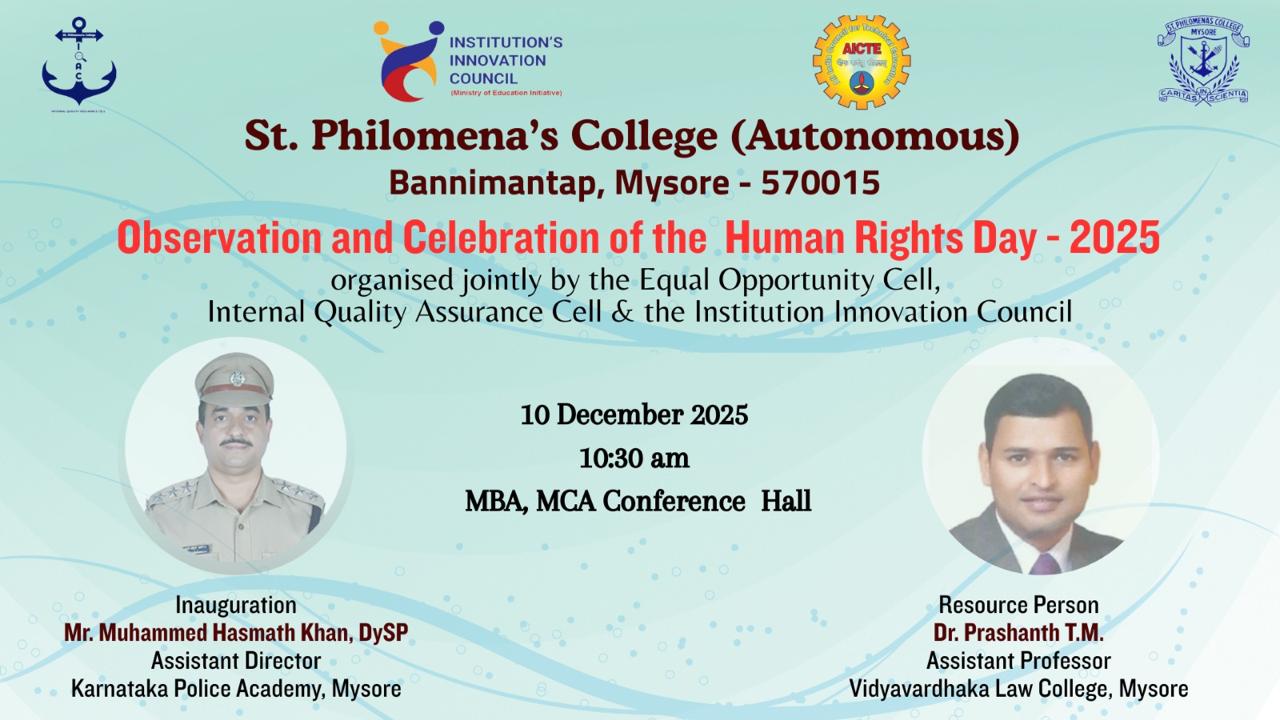 St. Philomena’s College (Autonomous), Mysuru. Report on National Human Rights Day Celebration – 2025. Objectives: 1. To promote awareness about human rights and their importance in ensuring dignity, equality, and justice for all individuals. 2. To educate students and faculty …