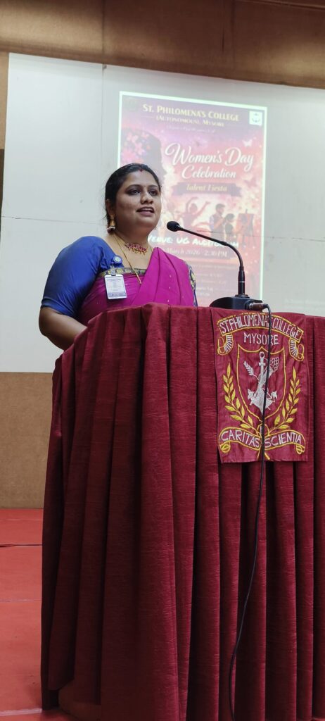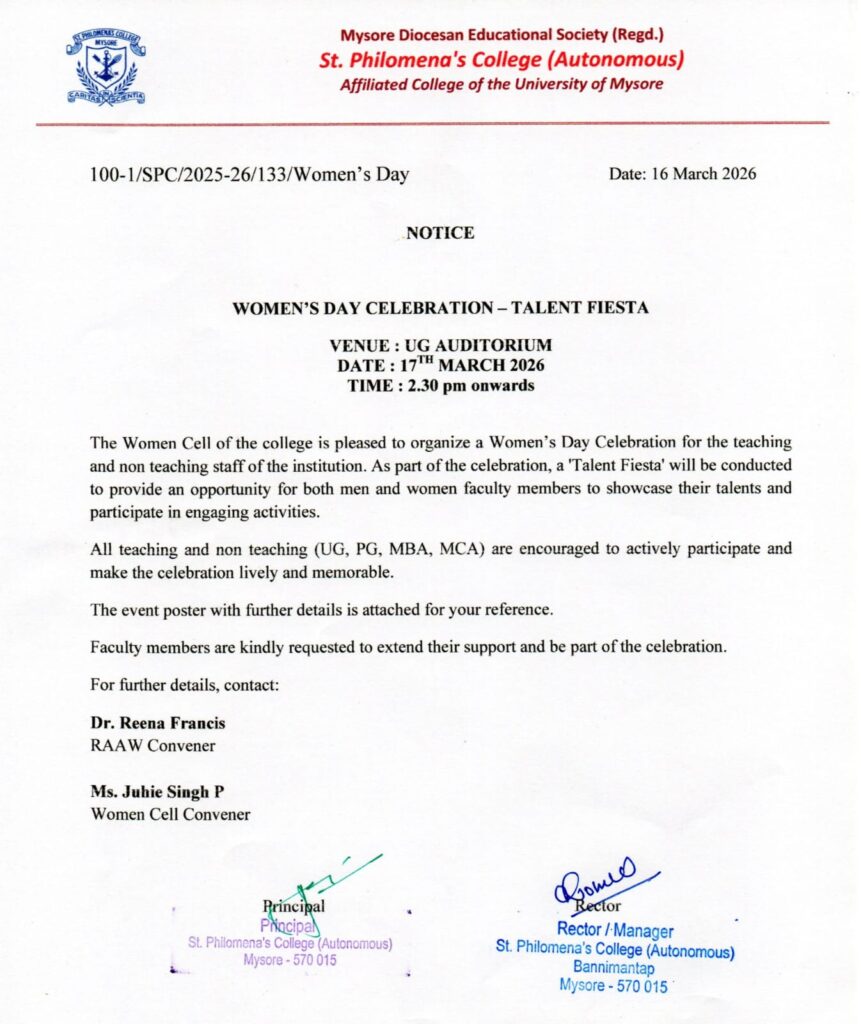 The Women’s Day celebration at St. Philomena’s College (Autonomous), Mysore was organized with great enthusiasm and active participation from faculty members. The program was conducted under the guidance of the Women’s Cell and RAAW, aiming to celebrate the spirit, strength, and talents of women while promoting inclusivity and engagement among all faculty members.
