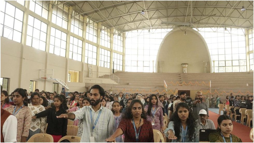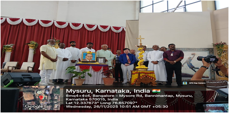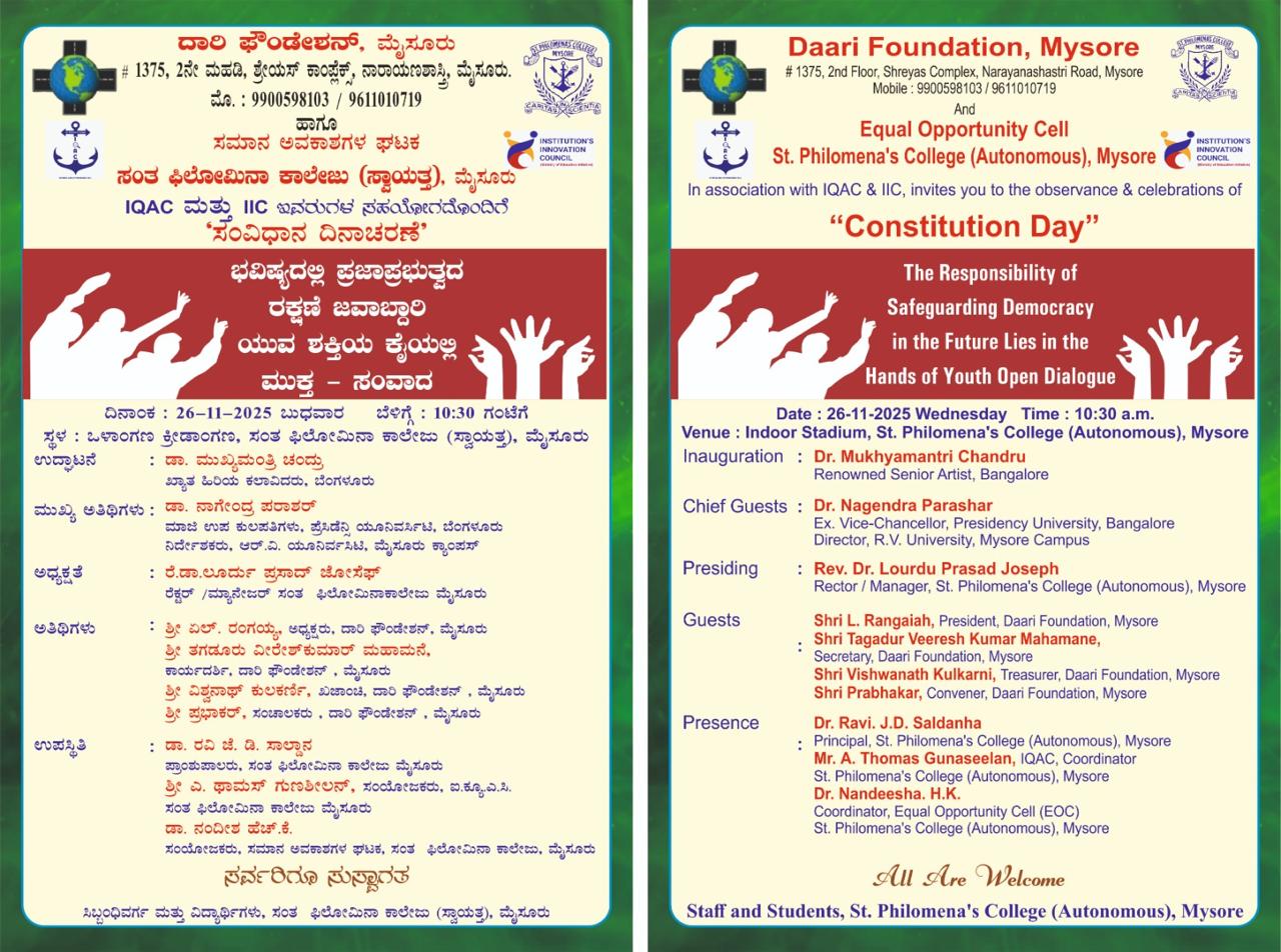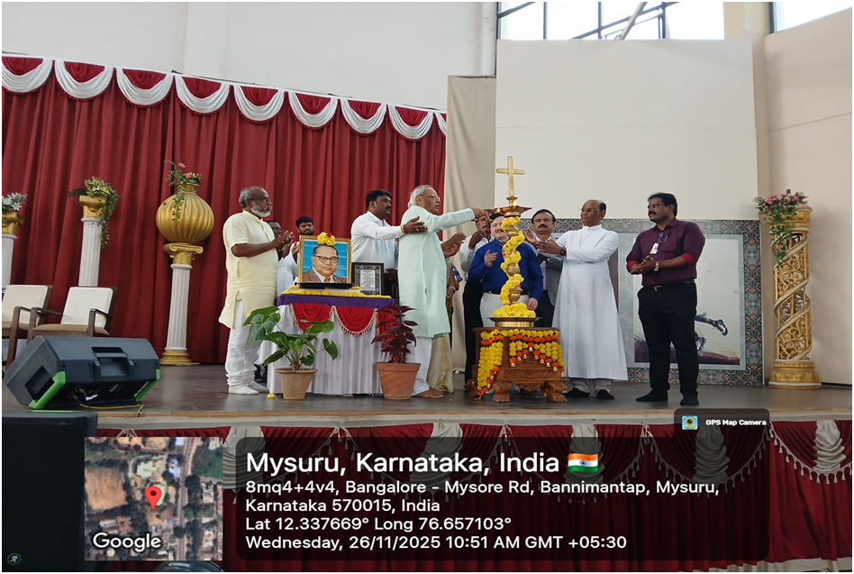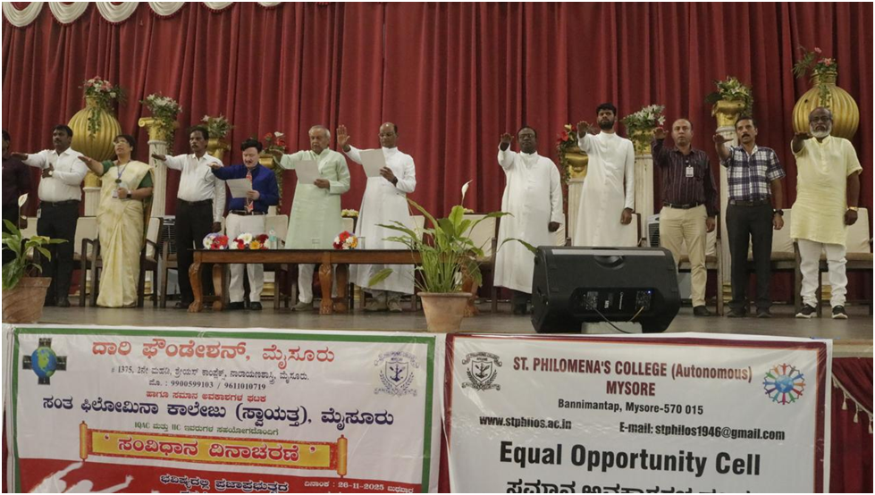 The Equal Opportunity Cell of St. Philomena’s College (Autonomous), Mysuru, in collaboration with IQAC and IIC, observed Constitution Day on 26th November 2025 with the theme “The Responsibility of Safeguarding Democracy in the Future Lies in the Hands of Youth: Open Dialogue.” The programme was organized at the Indoor Stadium, St. Philomena’s College, and began at 10:30 a.m. with the participation of dignitaries, faculty members, and a large number of students.