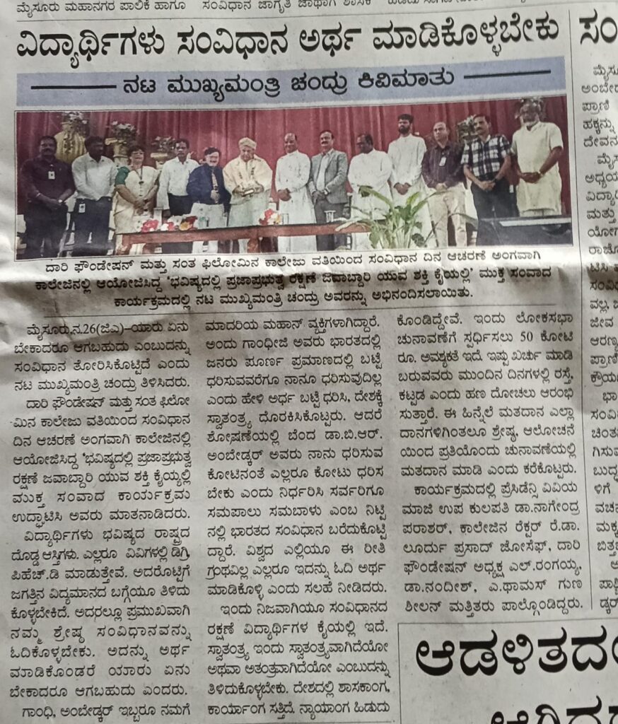 The Constitution Day Celebration 2025 at St. Philomena’s College proved to be an intellectually enriching and inspiring programme. It not only honored the legacy of the Indian Constitution but also strengthened constitutional awareness and responsibility among the youth. The active participation and enthusiasm of students made the event meaningful and impactful.