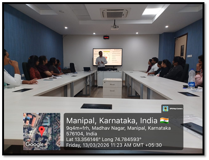 Dr. Manesh Thomas, CEO, Manipal-GoK Bioincubator, addressed the students and provided valuable insights into the biotechnology innovation ecosystem, startup incubation, and research translation.