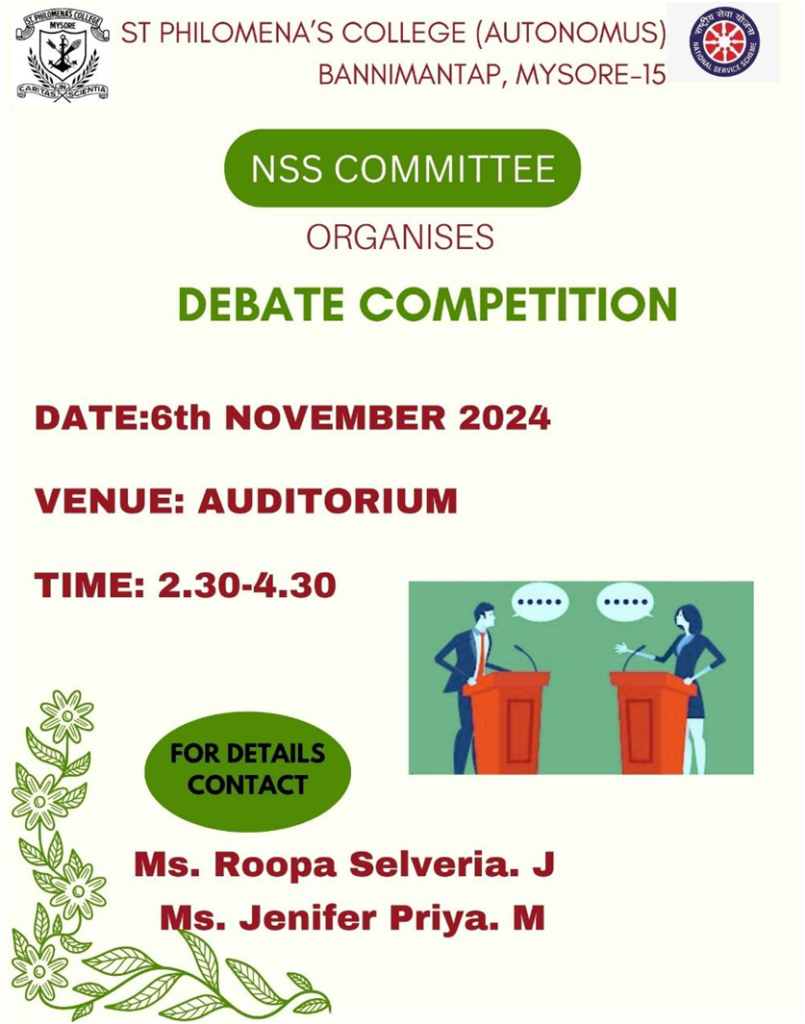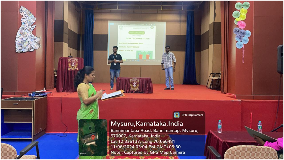 The NSS committee organised a Debate Competition on the topic “ Banning Tobacco – Government Duty Or Personal Choice” on 6th November 2024 at 2.30 pm in the College Auditorium. Around Eight students from various streams participated with great enthusiasm.The aim of organizing the debate competition was to spread awareness among the students on the consequences of tobacco consumption also its impact on passive smokers.