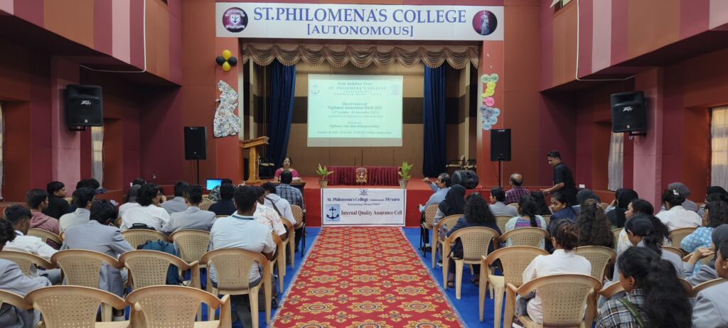 Dr. B. Shyla, faculty member, PG Department of Chemistry, delivered an informative talk on Anti-Corruption Awareness at the College Auditorium- Pledge: Corruption-Free India Pledge was administered to participating students