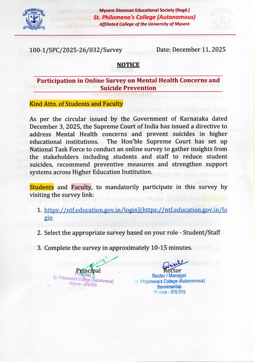 Online Survey on Mental Health Posted by Mirium Categories Events, Events, Events, Flash News, Flash News Date December 11, 2025 https://ntf.education.gov.in Share: Mirium Previous post International Mountain Day December 11, 2025 Next post Placement Drive: December 11, 2025 You may also like PG Odd Semester Exam Timetable – Jan 2026 December 16, 2025 Celebration of Vijay Diwas December 16, 2025 Nimblix Recruitment SCAM Warning December 15, 2025