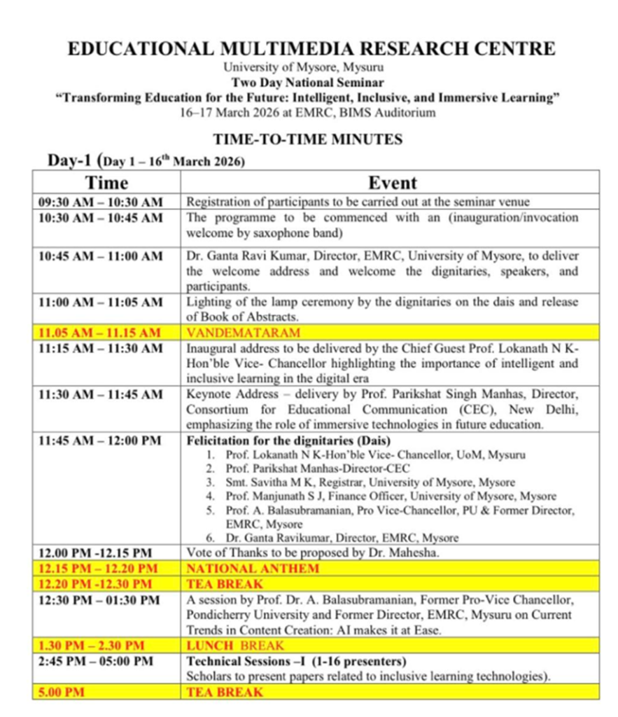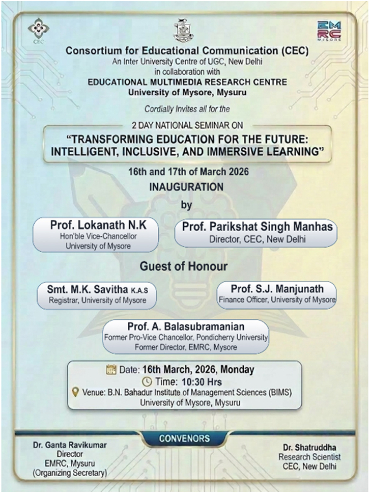 A two-day national seminar titled “Transforming Education for the Future: Intelligent, Inclusive & Immersive Learning” was organized on 16–17 March 2026 at the Educational Multimedia Research Centre (EMRC), University of Mysore, in collaboration with the Consortium for Educational Communication (CEC), New Delhi.