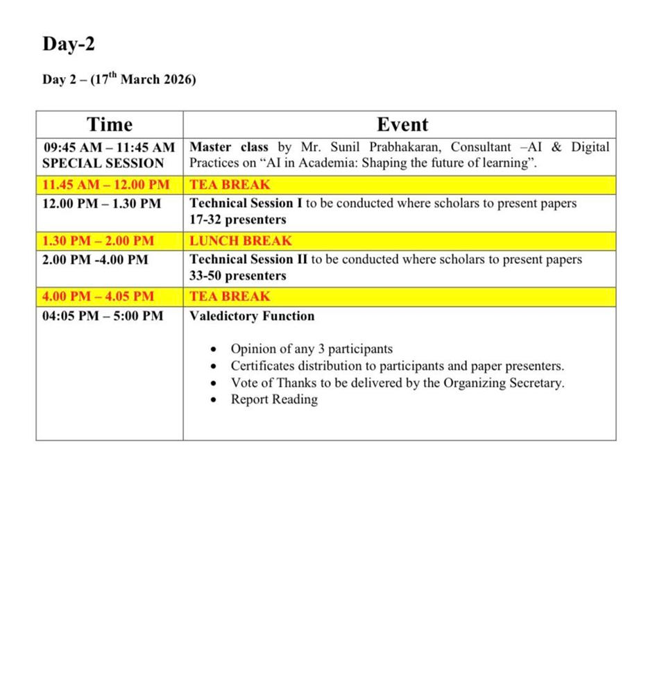 - A masterclass by Mr. Sunil Prabhakaran on “AI in Academia: Shaping the Future of Learning”, focusing on digital practices and artificial intelligence in education.