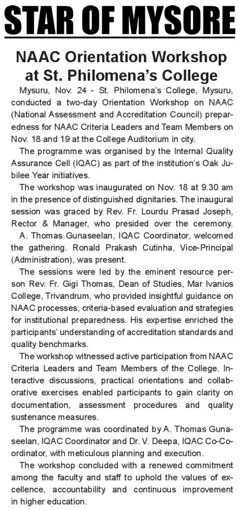 Two day NAAC orientation : Posted by Mirium Categories Events, Events, Events, Flash News, Flash News, IQAC Date November 17, 2025 Share: Mirium Previous post National Journalism Day November 17, 2025 Next post Workshop on November 17, 2025 You may also like National Youth Day 2025 January 12, 2026 NSS Officer and volunteersparticipated in the Kukkarahalli Lake cleanliness drive January 12, 2026 January 8, 2026