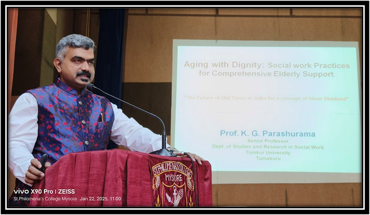 Keynote Address: Prof. Parushurama K.G., Chairman, DOS in Social Work, University of Tumkur, delivered the keynote address on “Aging with Dignity: Social Work Practices for Comprehensive Elderly Support”. Highlighting the alarming growth of the elderly population globally, now at 1.6 billion with 80% residing in developing countries, he emphasized the challenges such as inadequate healthcare, lack of affordable housing, and limited access to nutritional food. He pointed out the increasing feminization and ruralisation of ageing populations, with 70% of elders residing in rural areas.