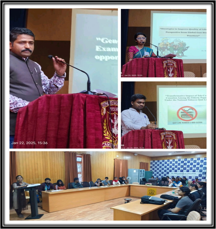 Participants presented papers on various aspects of elderly healthcare, social security policies, and innovative solutions to address the challenges faced by senior citizens on Day 01 and Day 02.Presentation was held in two venues. In the first venue presentation was by Research Scholars and academetians, in this 11 papers were presented also there was an online presentation from a International Research Scholar of Mangalore University, Karnataka from Vietnam. Also in the second venue 10 presentations was done by the student scholars from across various states of India. Students of Tribal University, Andhra Pradesh, Madras Christian College, Tamil Nadu and also from various districts from Karnataka Shared their academic knowledge for a better holistic elderly care.